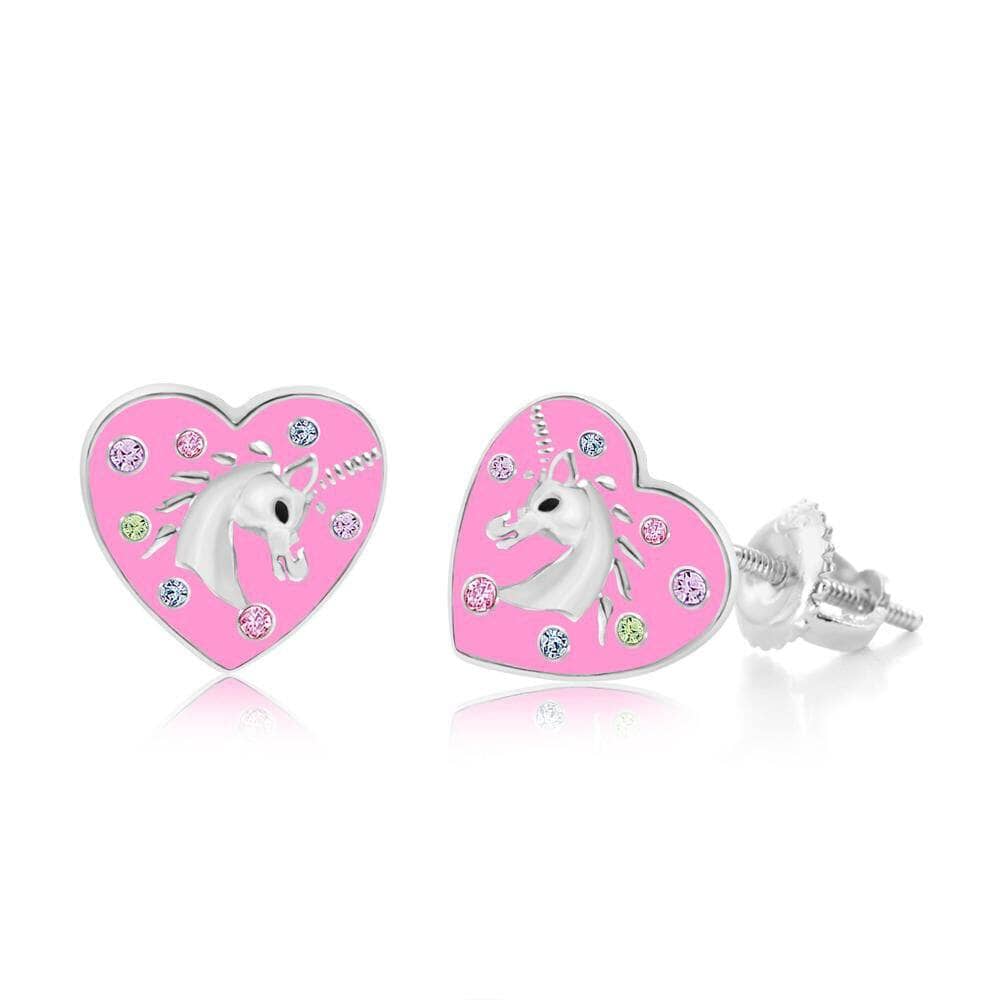 Crystal Pink Enamel Heart Unicorn Screwback Stud Earrings