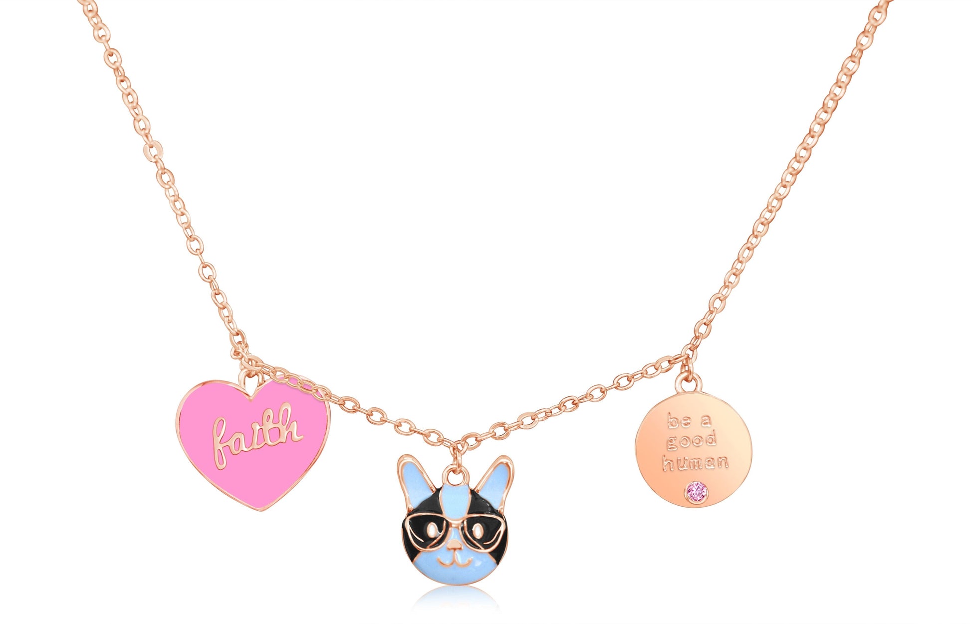 A delightful necklace featuring heart, kitty, and circle charms that any young girl will adore. Crafted with safety as the priority, it uses non-toxic materials so she can enjoy wearing it with complete confidence.